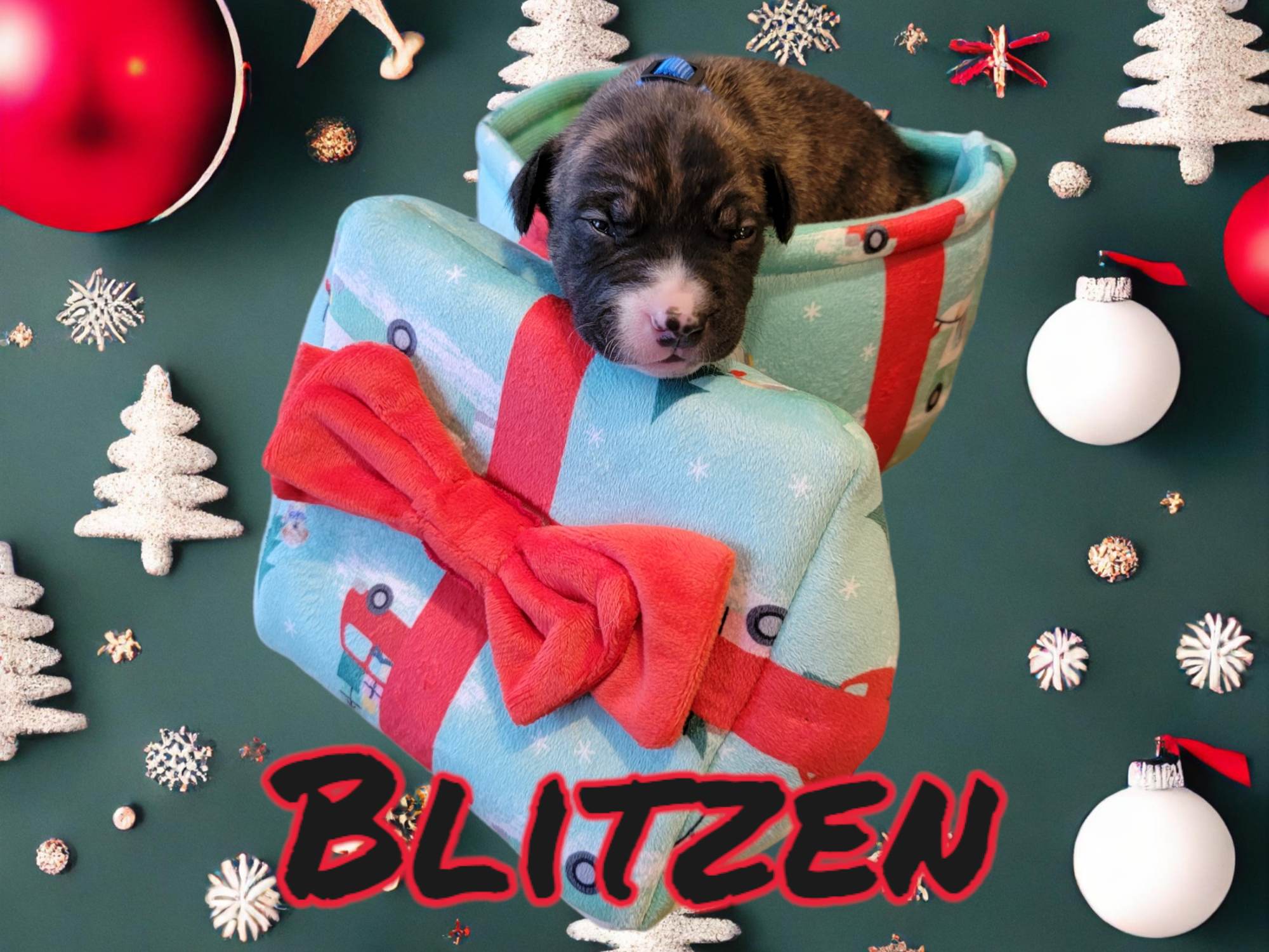 Blitzen is a puppy that will be available for adoption at 8 weeks old (approximately January 21, 2023). He is a Pit Mix puppy and can’t wait to spoiled rotten by his new forever family.