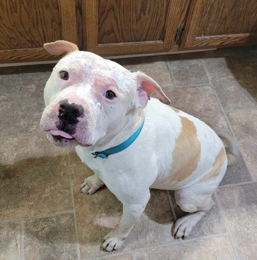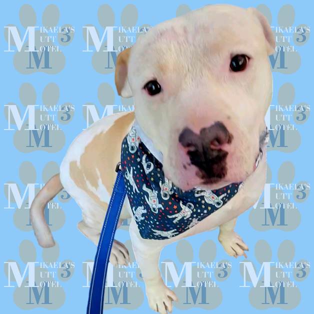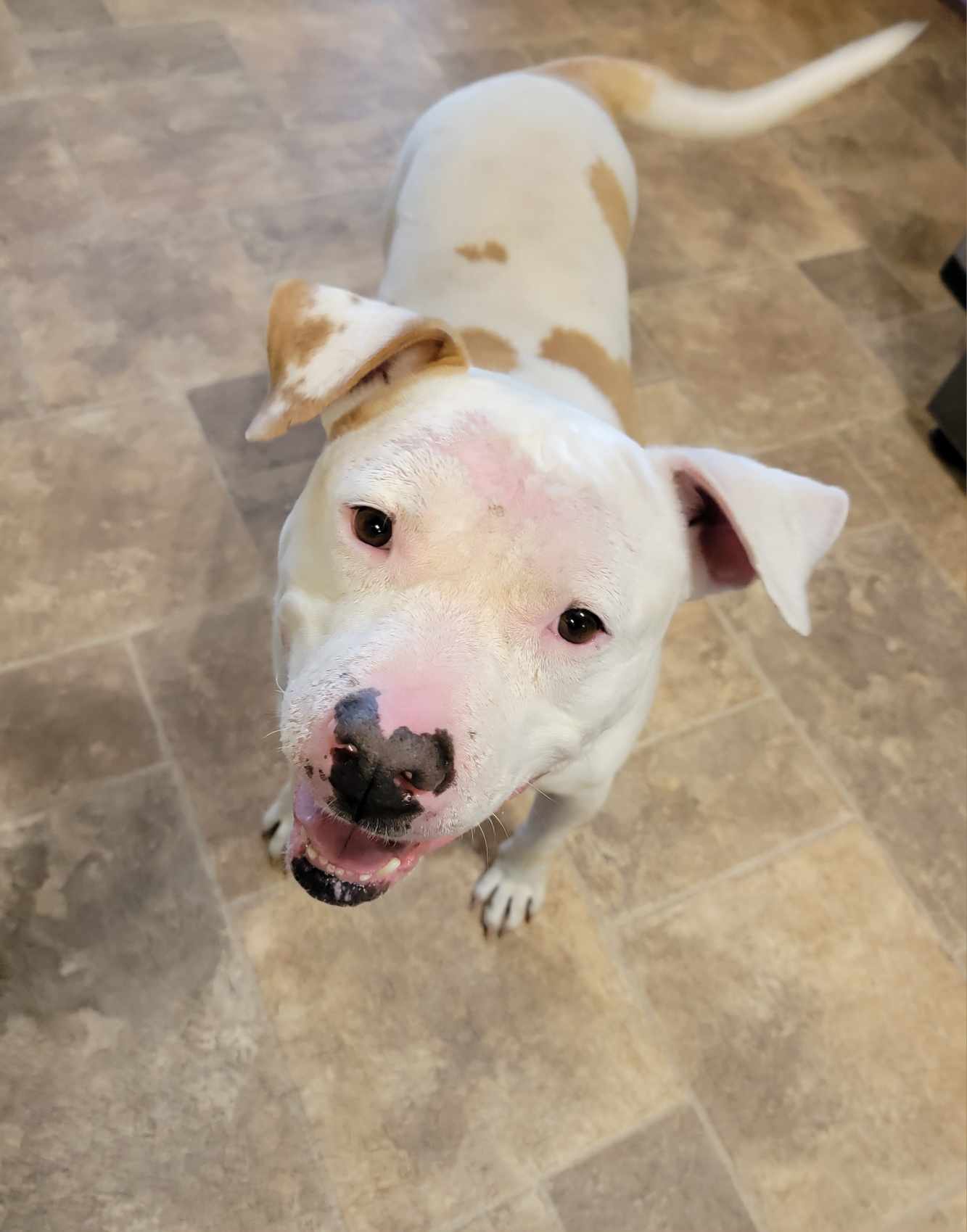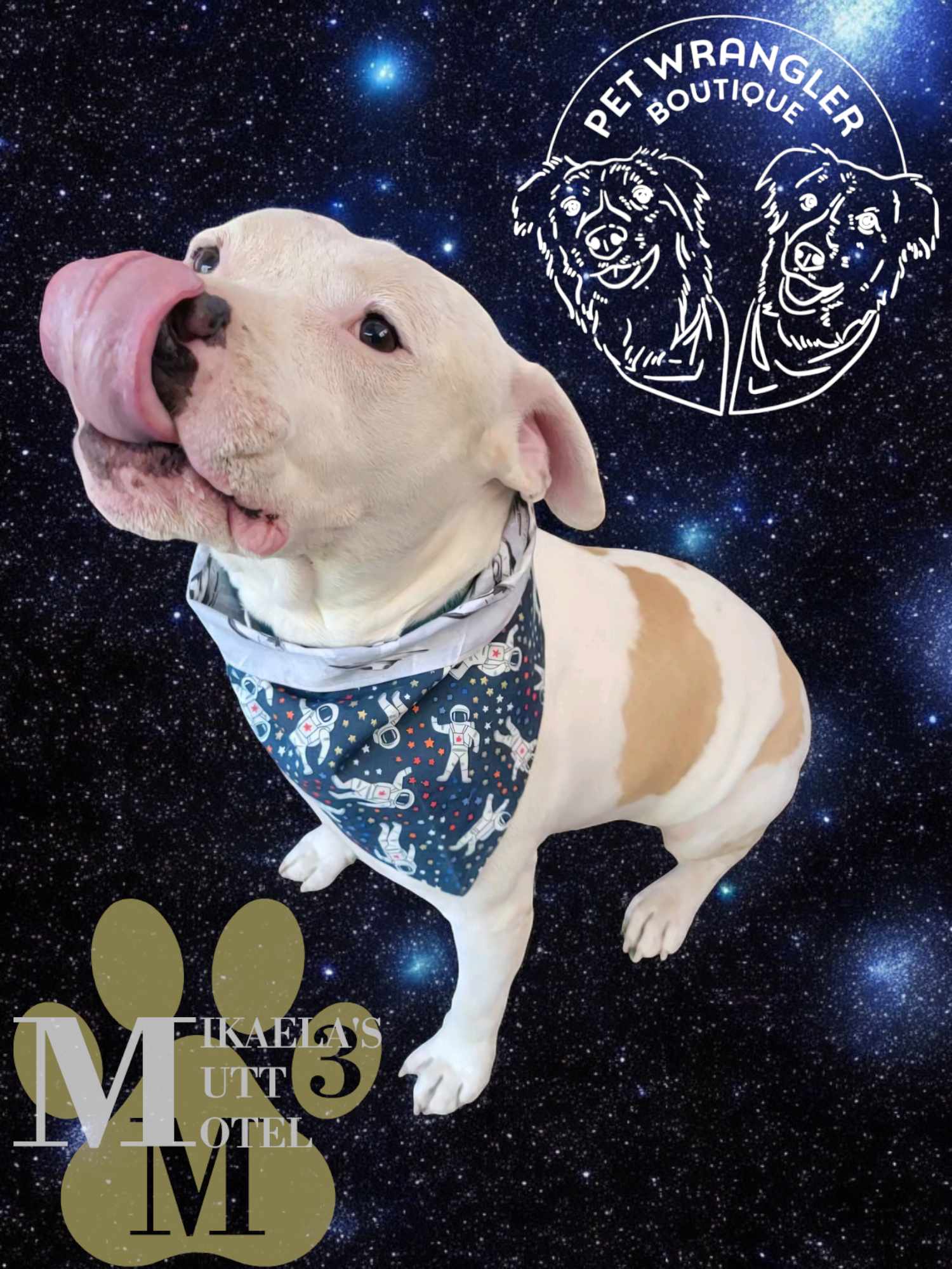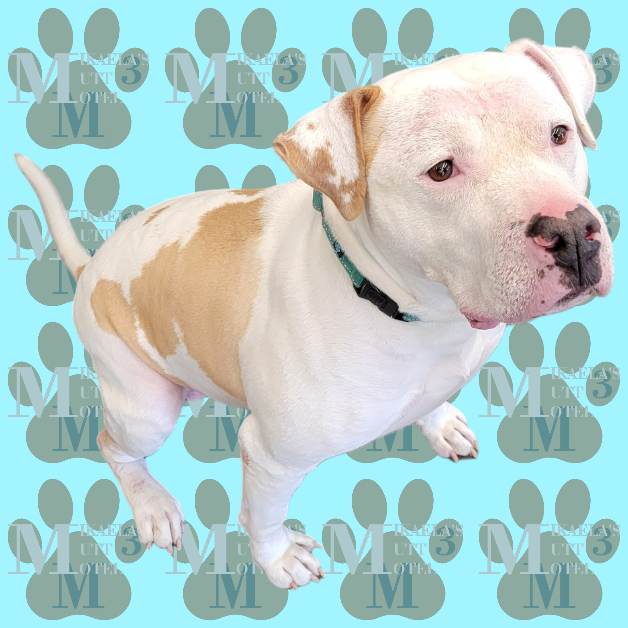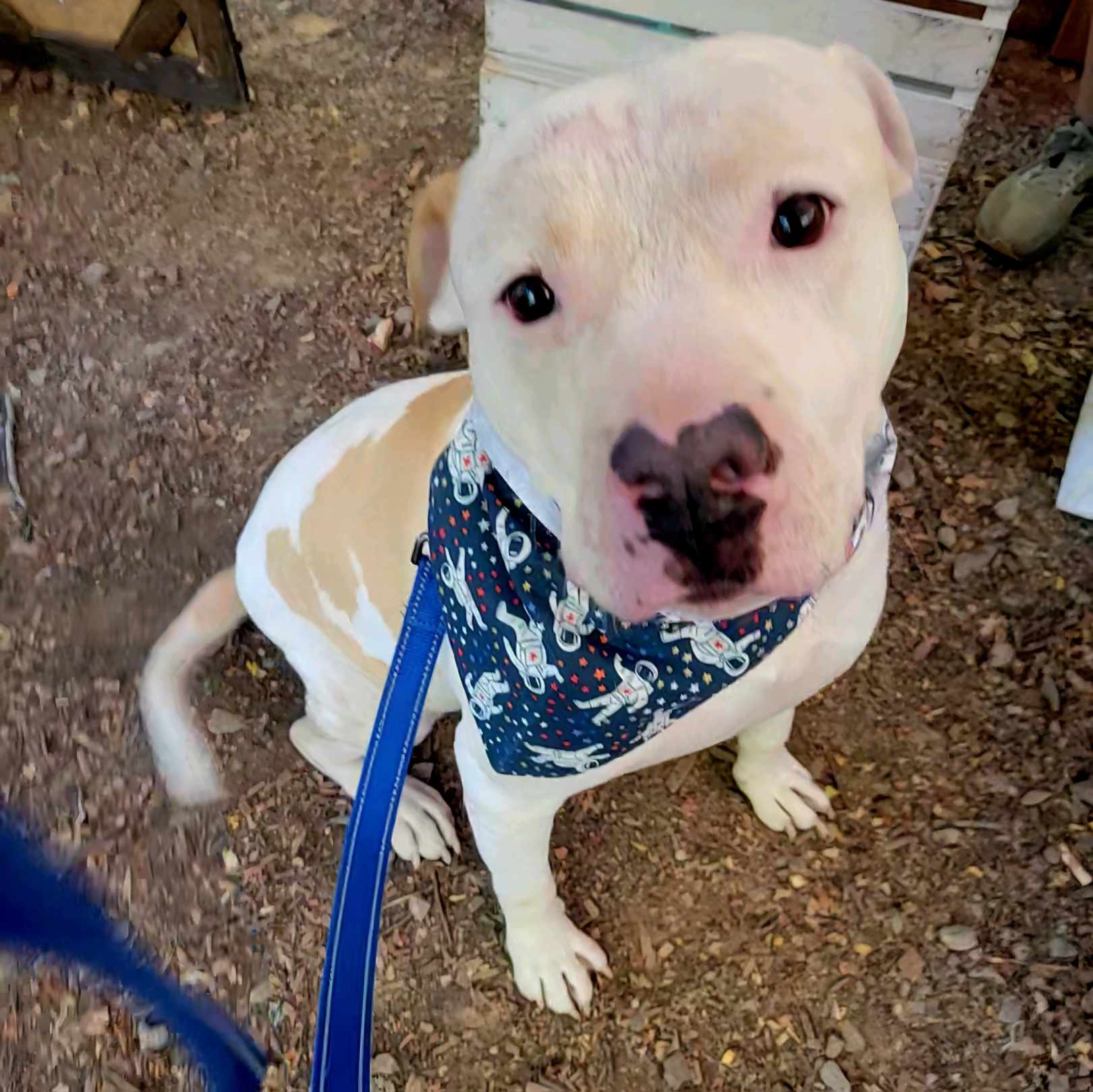 [adoption_info name=”Buzz Pawldrin” breed=”Pit Mix” gender=”Male” age=”5 years” weight=”65 pounds” color=”White w/Tan” house=”Yes” crate=”Yes” dogs=”Has done well” cats=”Unknown” kids=”Has done well” fence=”No”]
