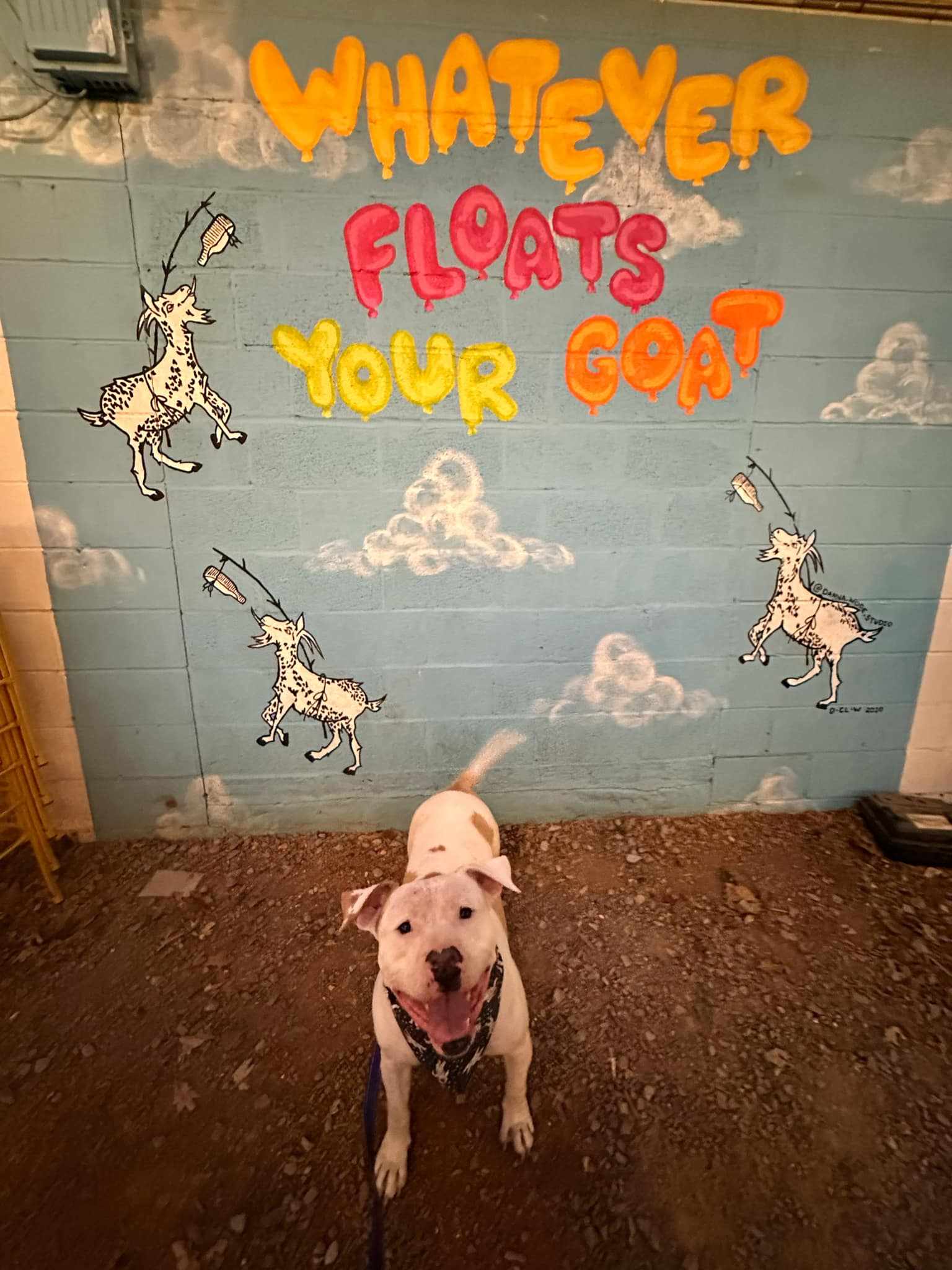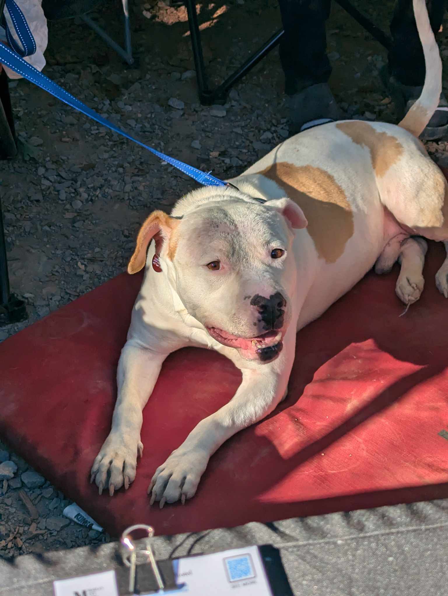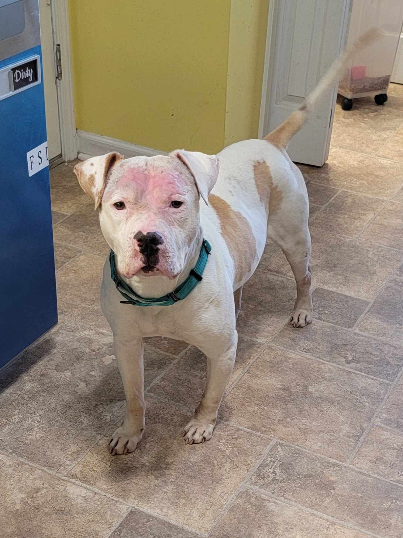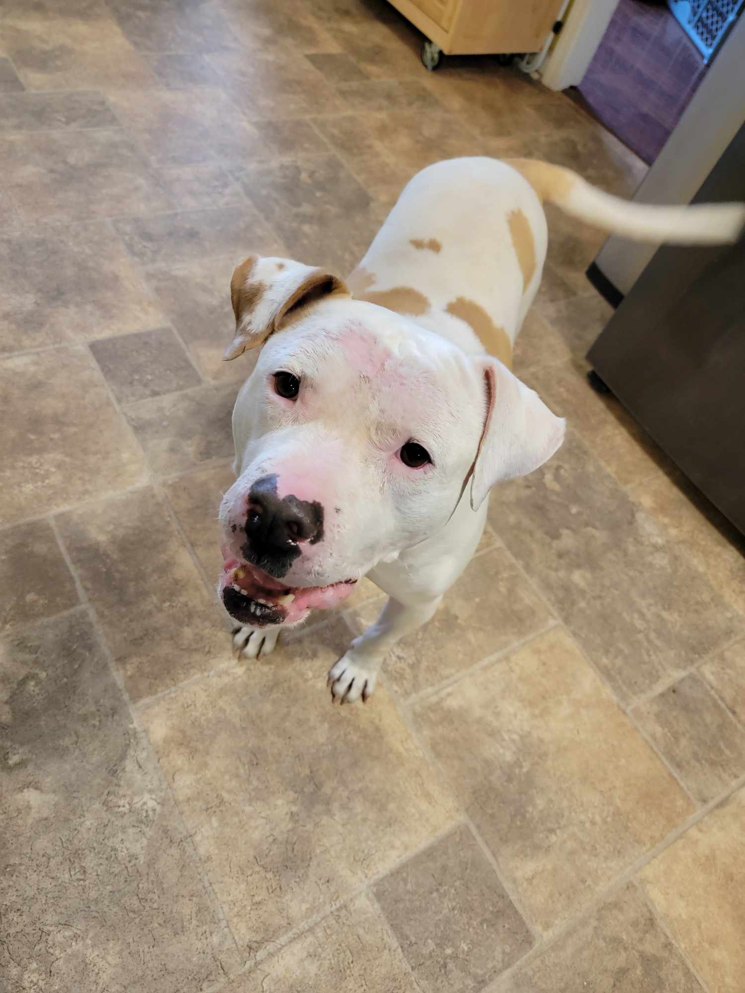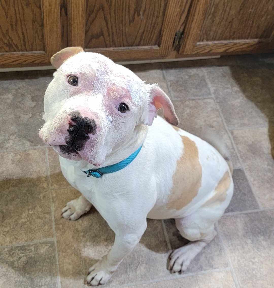 [adoption_info name=”Buzz Pawldrin” breed=”Pit Mix” gender=”Male” age=”5 years” weight=”65 pounds” color=”White w/Tan” house=”Yes” crate=”Yes” dogs=”Has done well” cats=”Unknown” kids=”Has done well” fence=”No”]