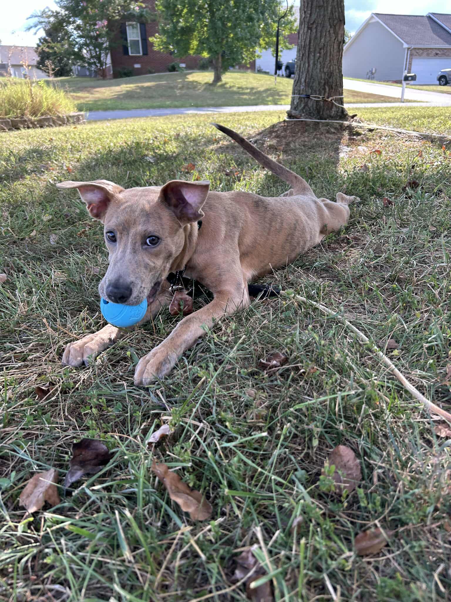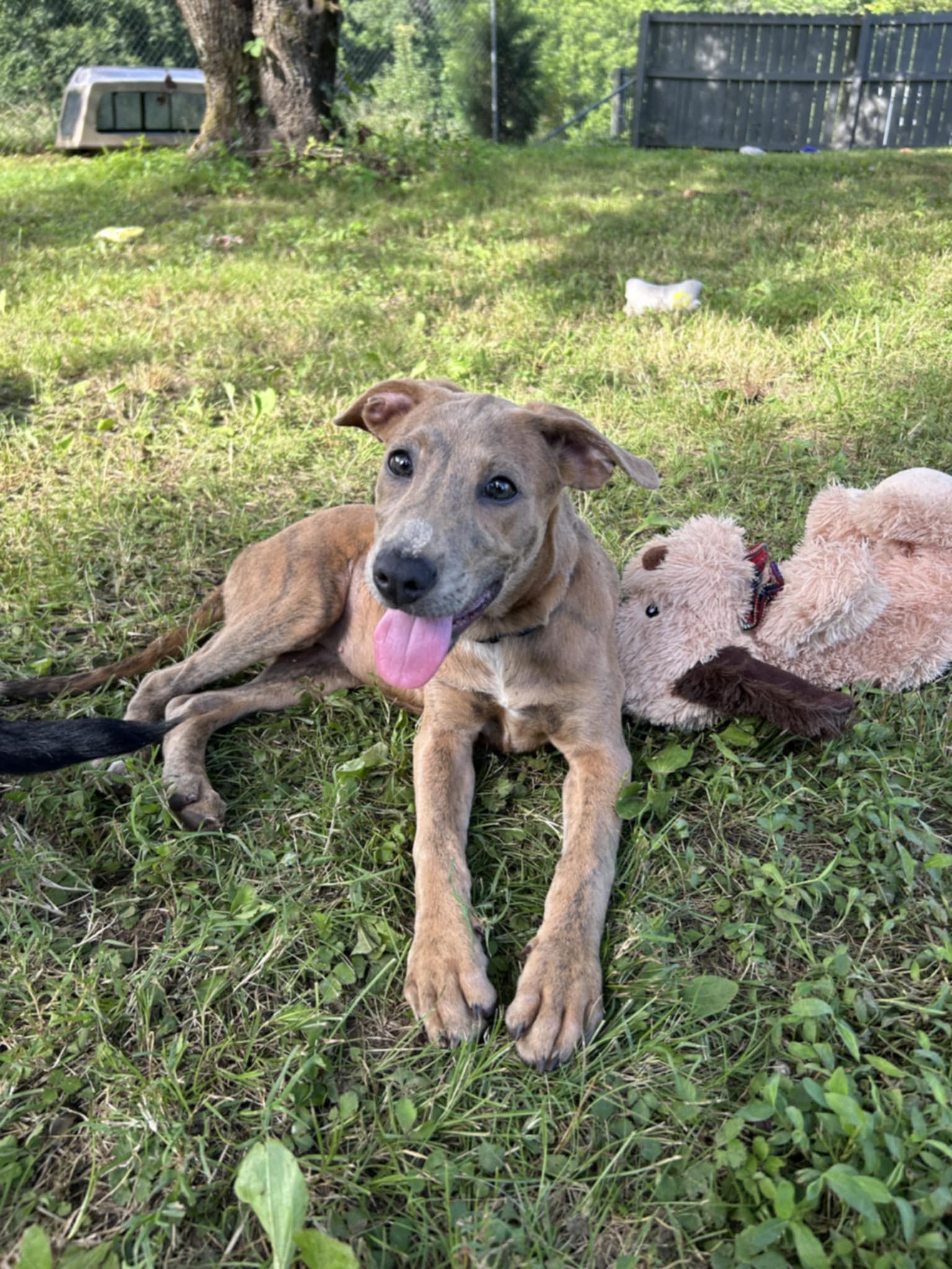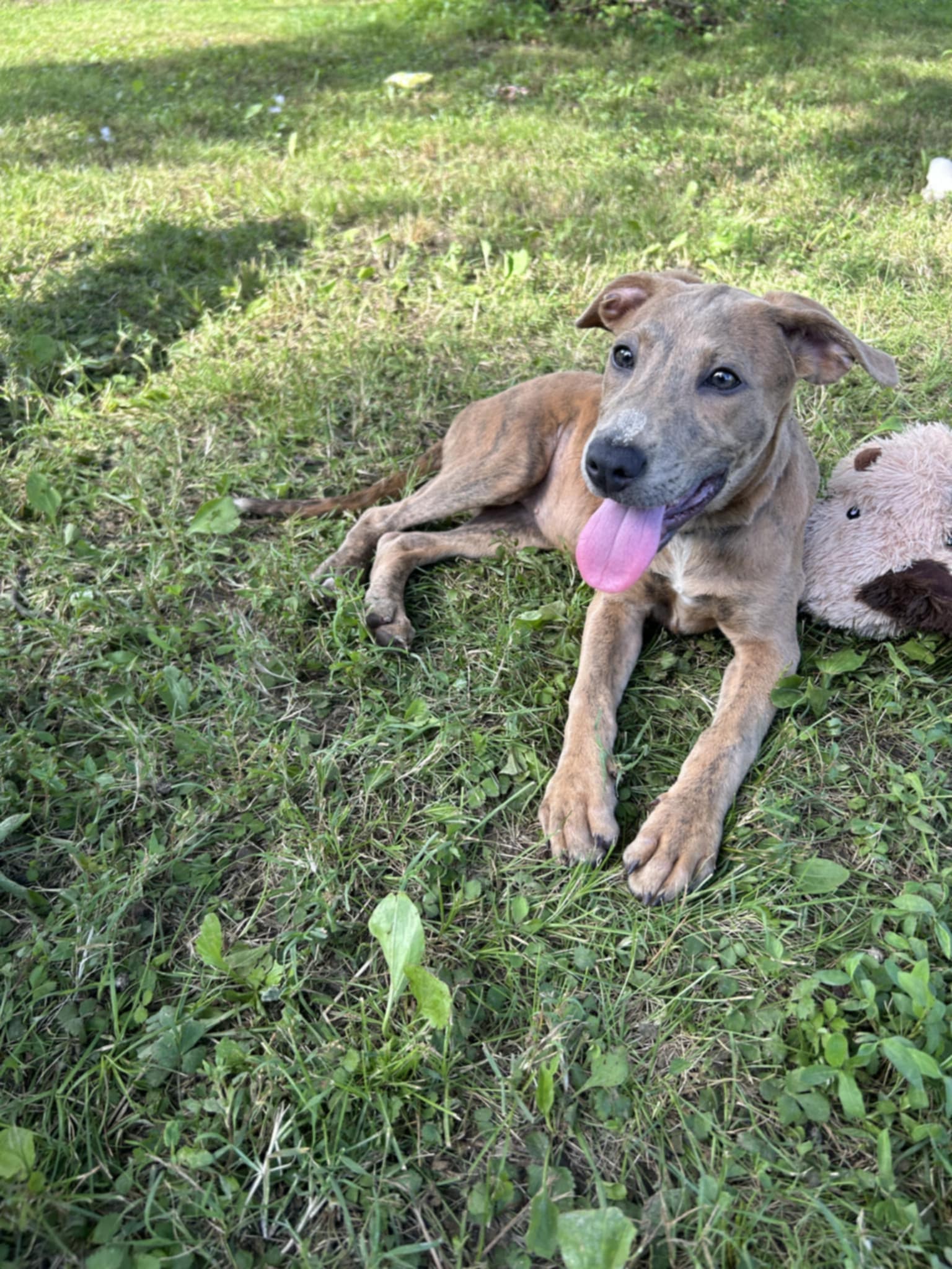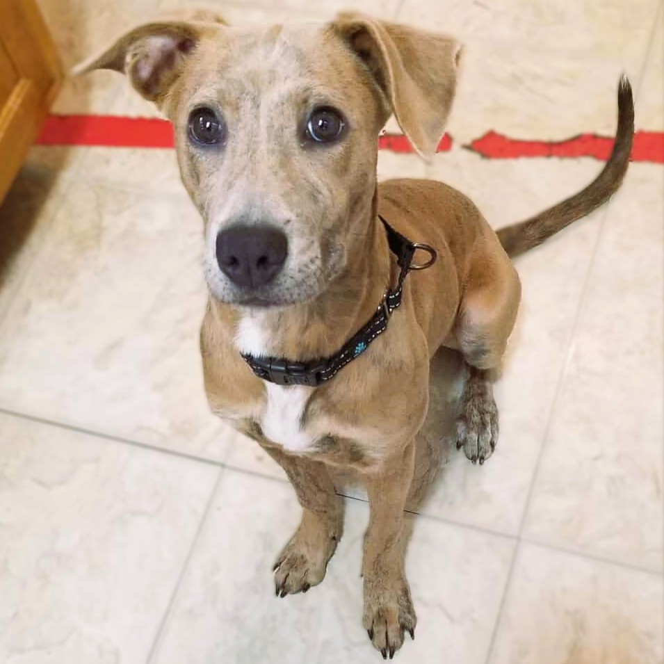 Cinnamon is a gorgeous 5-month-old pup with a sweet and gentle spirit. Weighing around 20 pounds, she has stunning brindle stripes and is a true beauty inside and out.