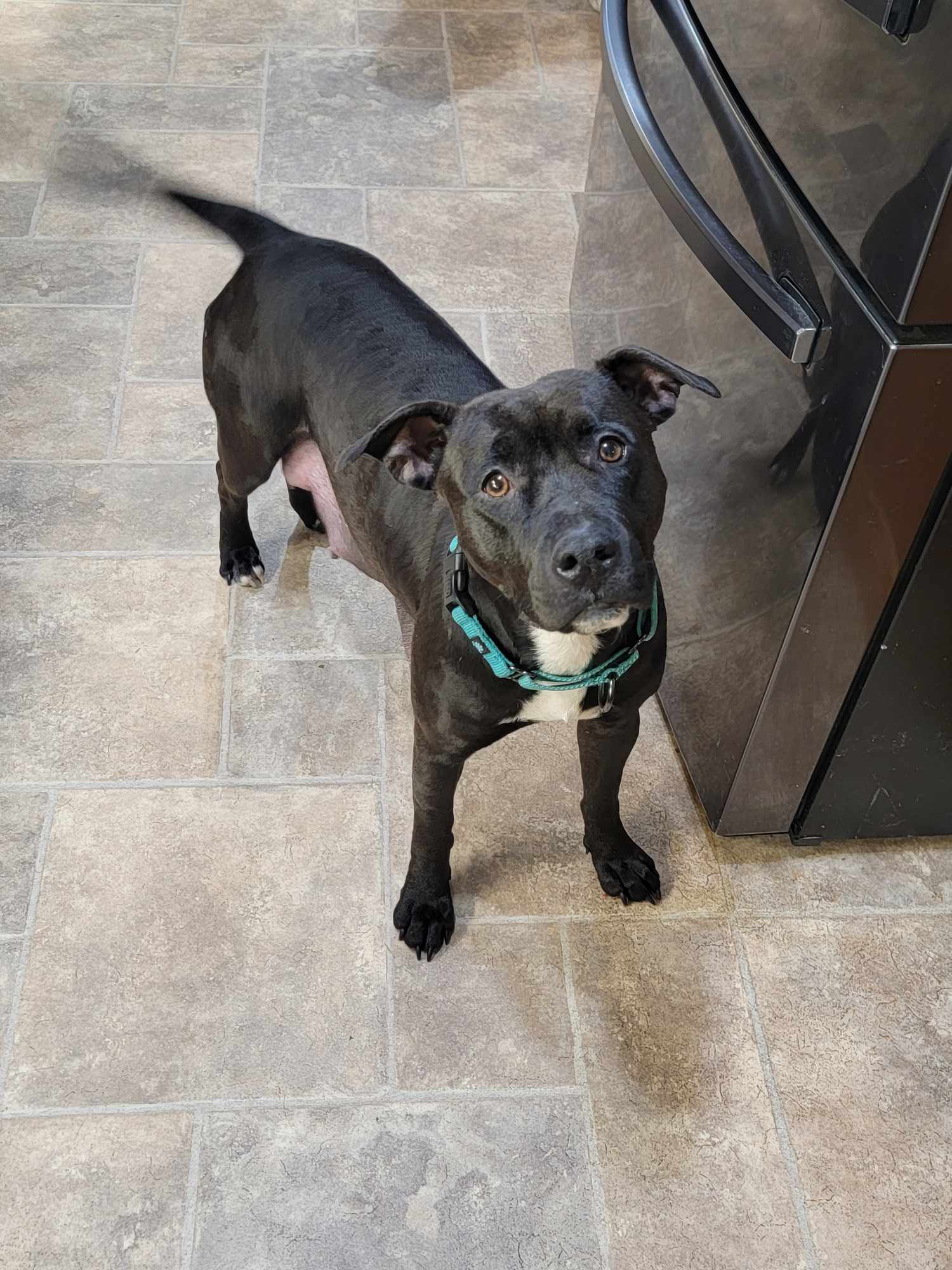 [adoption_info name=”Finley” breed=”Mutt” gender=”Female” age=”1 year” weight=”40 pounds” color=”Black w/White” house=”Yes” crate=”Yes” dogs=”Has done well” cats=”Unknown” kids=”Has Done Well” fence=”No”]