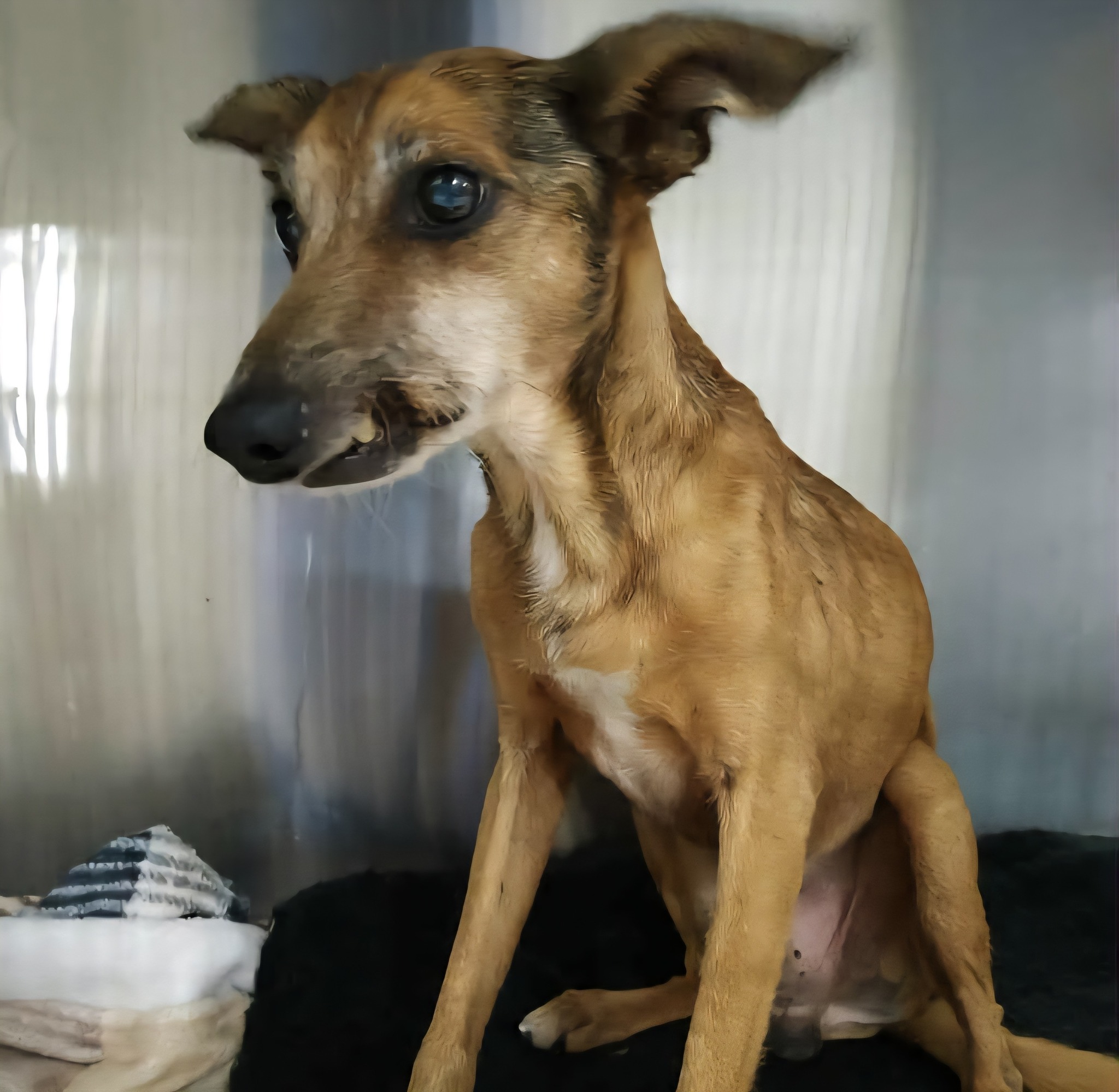 Meet Luigi, a truly special 12-year-old Italian Greyhound mix who desperately needs our help and a loving home. This sweet senior arrived at the shelter as a stray, and his condition was heartbreaking. He was severely underweight, with every bone in his tiny body visible – his ribs, spine, and hips stood out.
