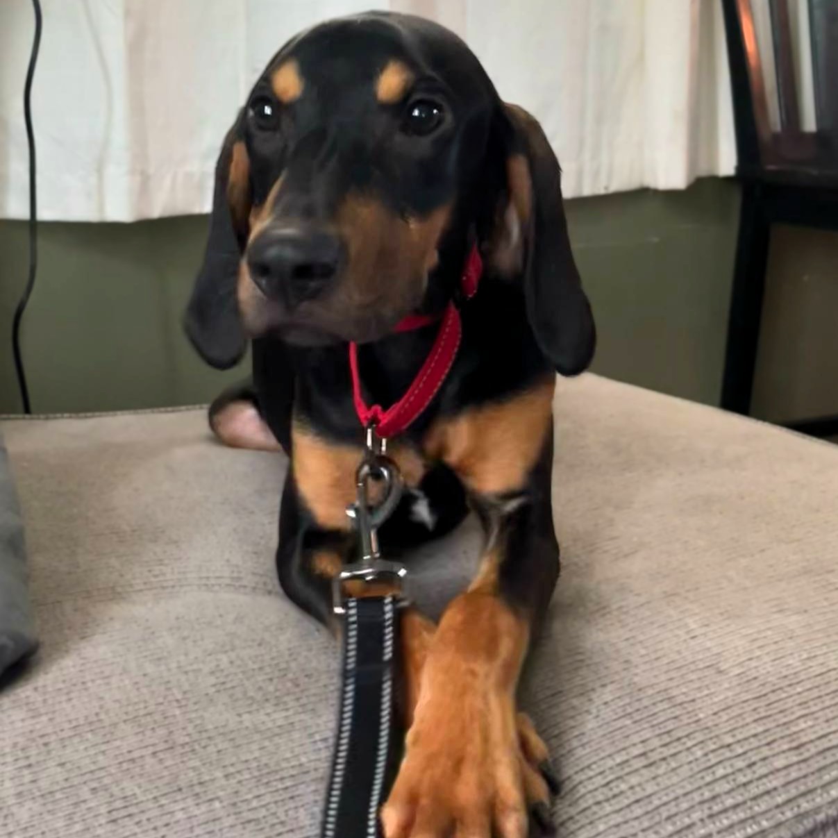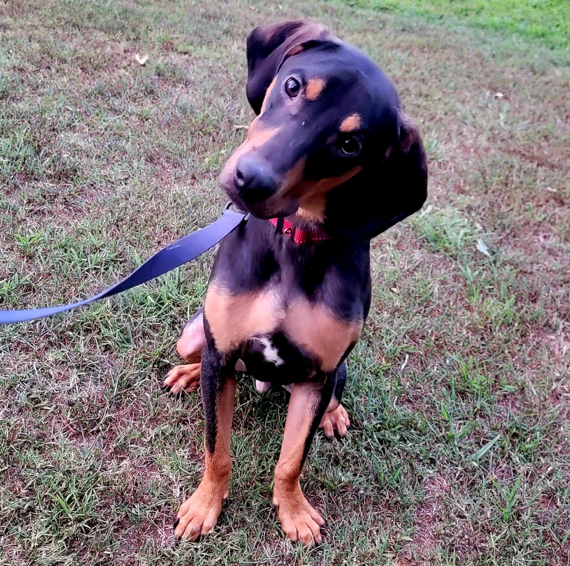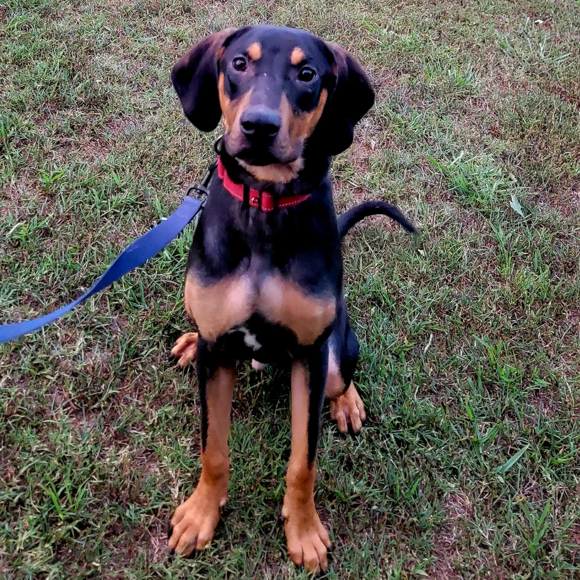 [adoption_info name=”Maxx” breed=”Mutt” gender=”Male” age=”7 months” weight=”~40 lb” color=”Black & Tan” house=”Mostly” crate=”Yes” dogs=”Has done well” cats=”Has done well” kids=”Has done well” fence=”No”]