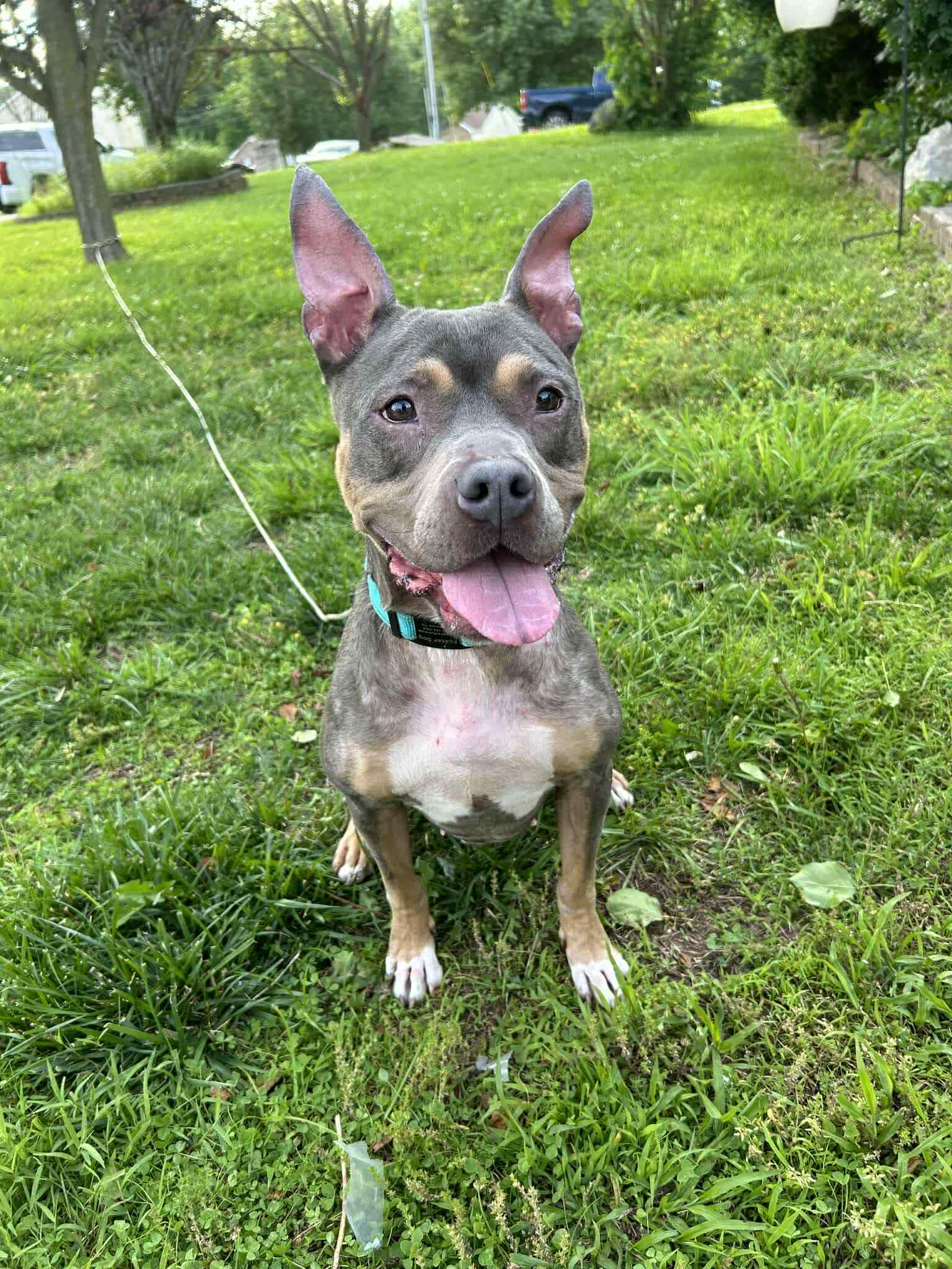 Woof! Let me tell you ’bout me, Mika! I started with a happy car ride from a loud place. I was a good size (60 pounds) and loved my new humans for a whole year, lots of tail wags!