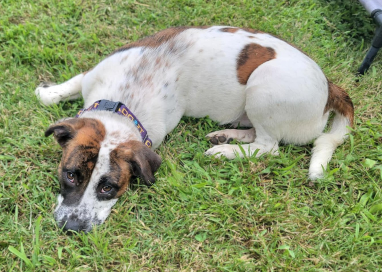 [adoption_info name=”Sugah” breed=”Mutt” gender=”Female” age=”1 year” weight=”~45 lb” color=”White w/Brindle” house=”Mostly” crate=”Yes” dogs=”Has done well” cats=”Unknown” kids=”Has done well” fence=”No”]