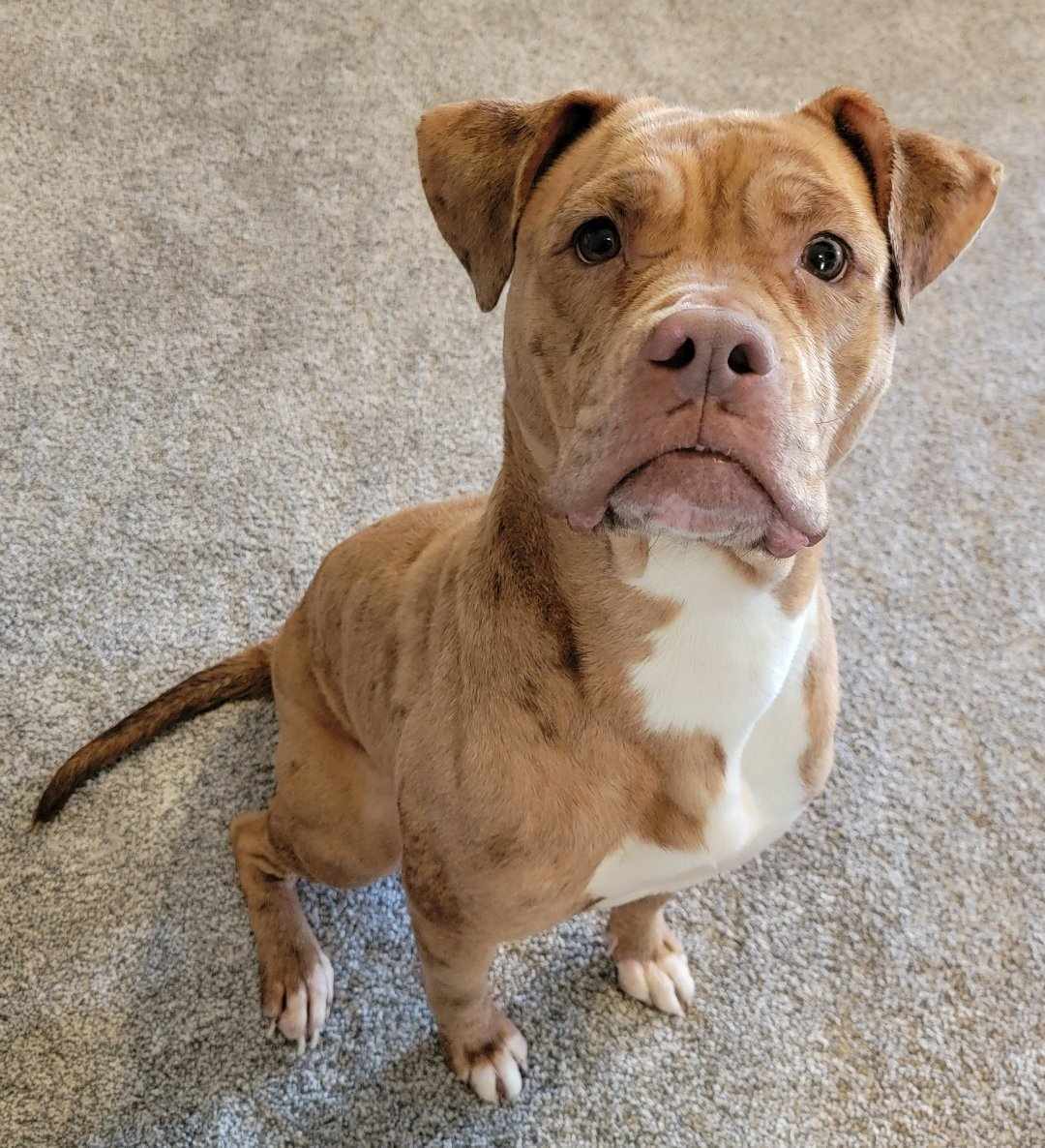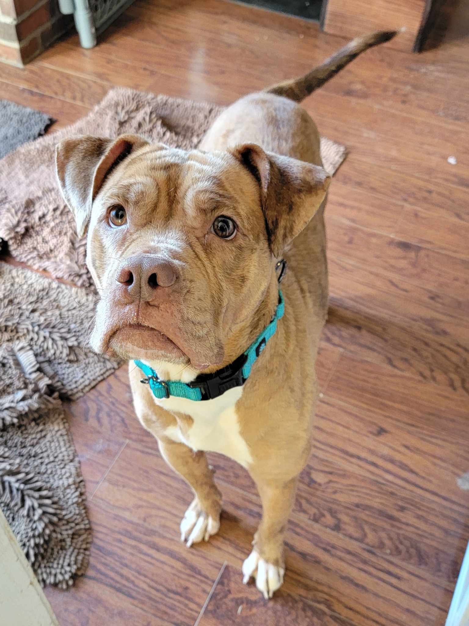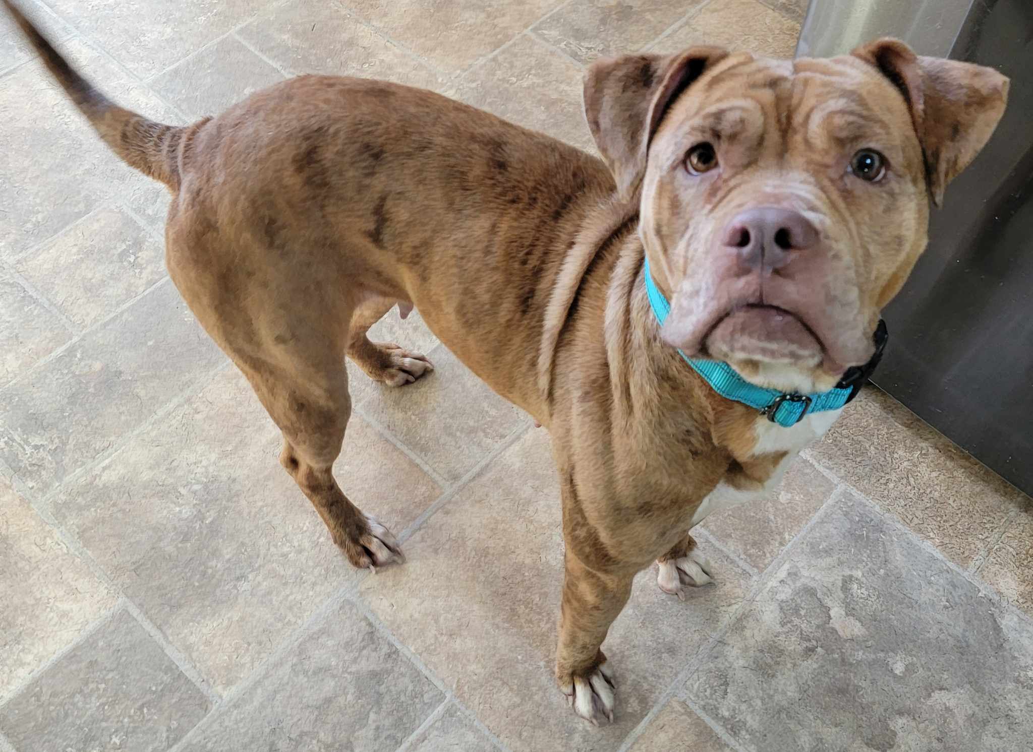 [adoption_info name=”Whoopi” breed=”Mutt” gender=”Female” age=”3 years” weight=”50 pounds” color=”Fawn Brindle” house=”Yes” crate=”Yes” dogs=”Has done well” cats=”Unknown” kids=”Has Done Well” fence=”Yes”]